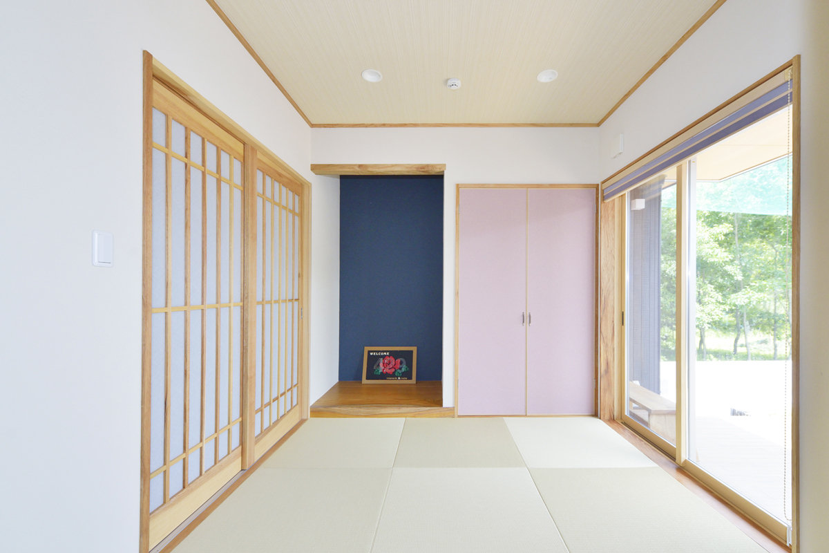 大切なゲストのおもてなしは、南向きに大きな窓をあしらった明るい和室。家の中のどこにいても気持ち和らぐ邸宅です。