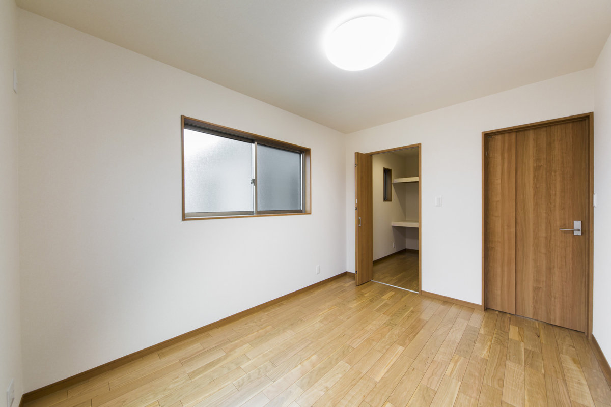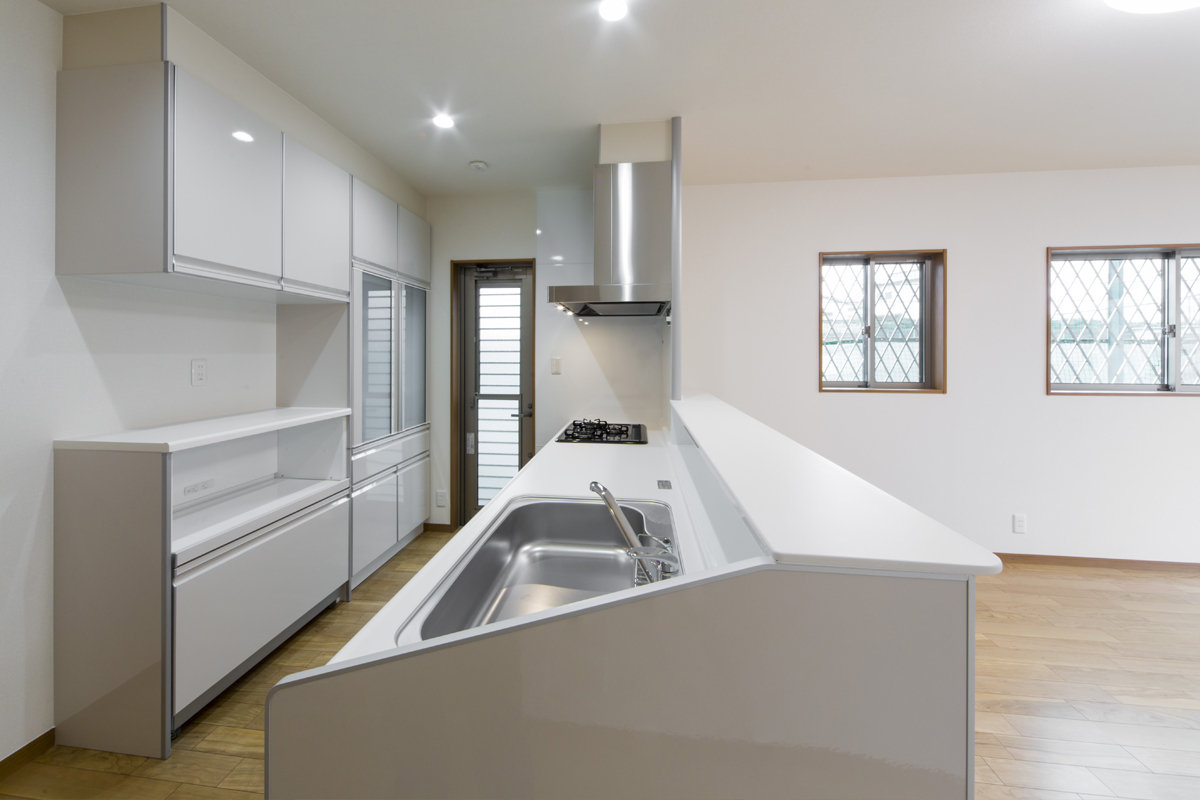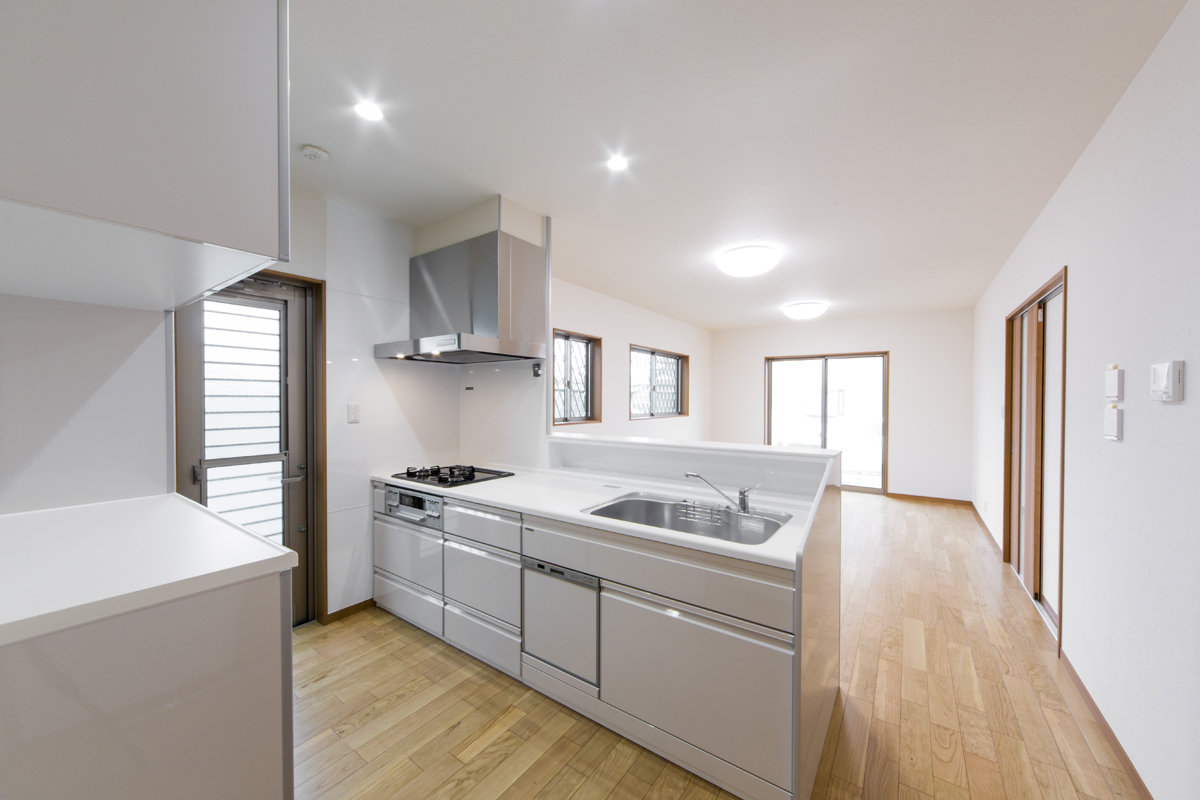 床材や建具には天然木を使用し木の持つ優しを大切に。キッチンやトイレ壁紙は白色で統一し、どこにいても心地の良い家。あえて飾りを用いない、シンプルな邸宅です。