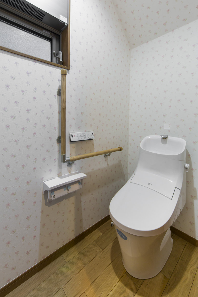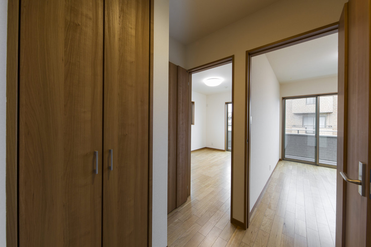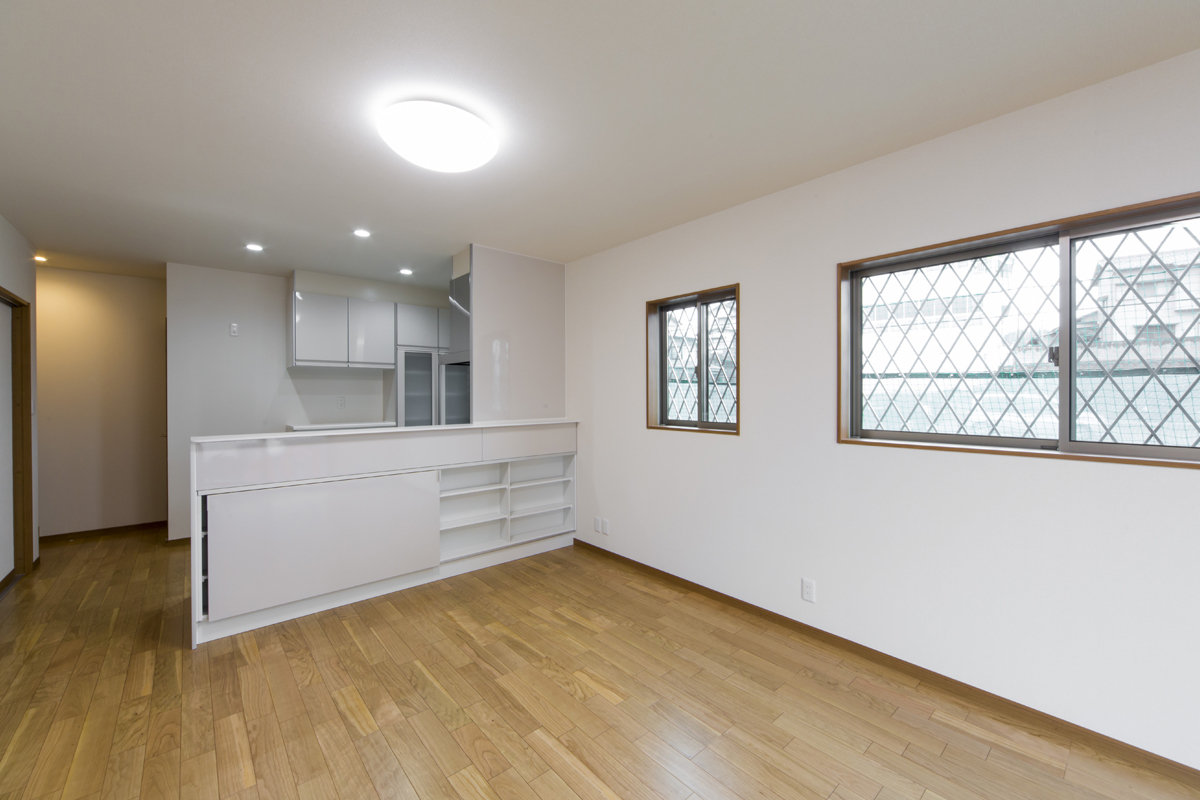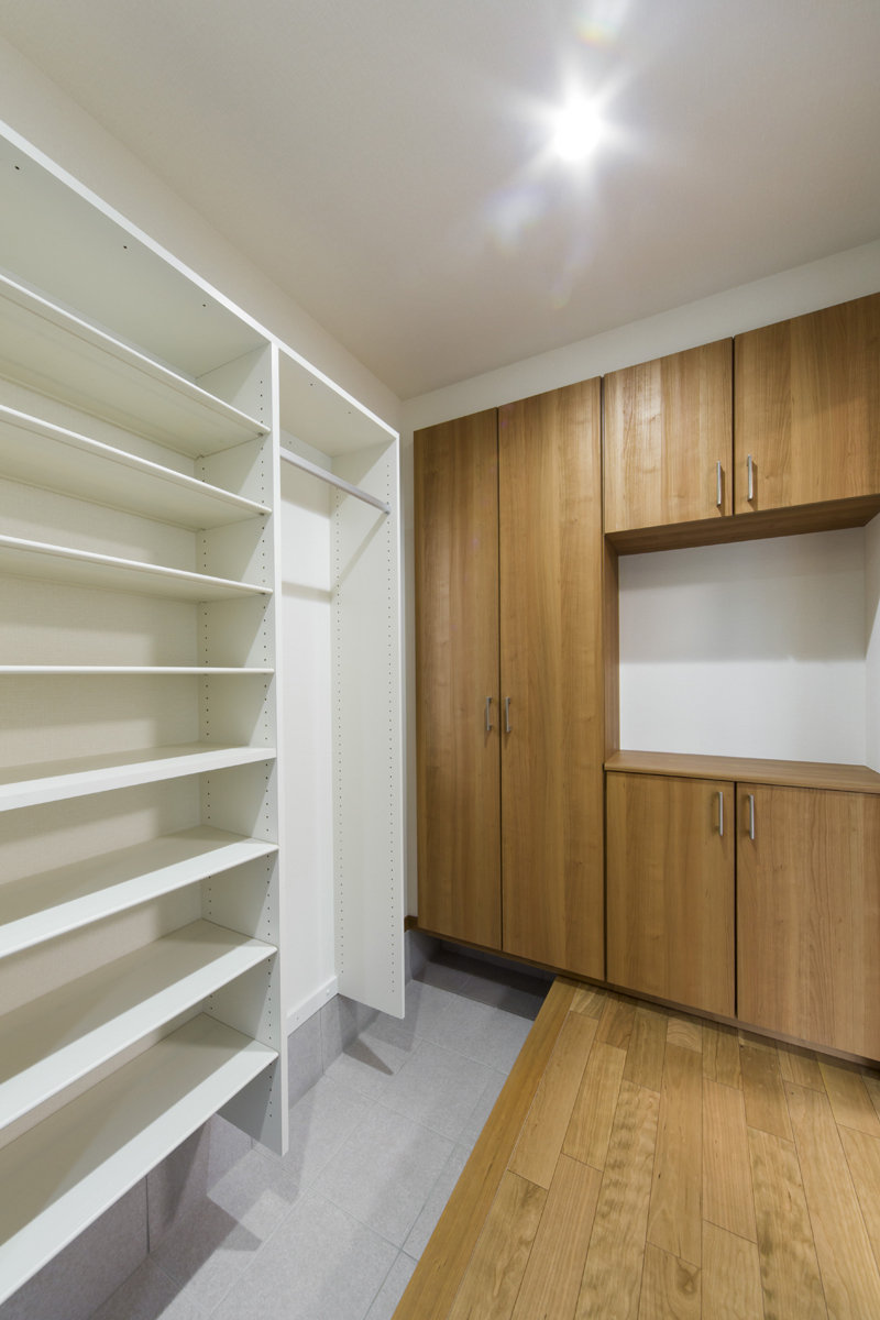 床材や建具には天然木を使用し木の持つ優しを大切に。キッチンやトイレ壁紙は白色で統一し、どこにいても心地の良い家。あえて飾りを用いない、シンプルな邸宅です。