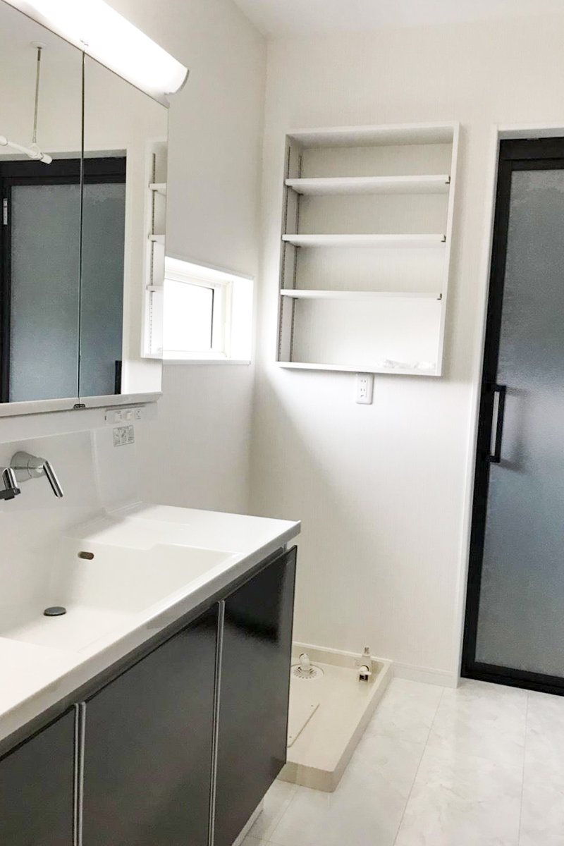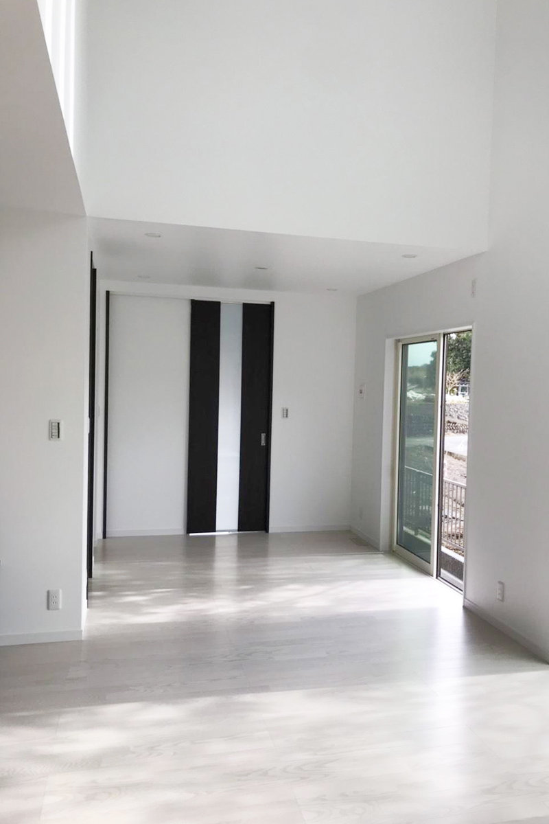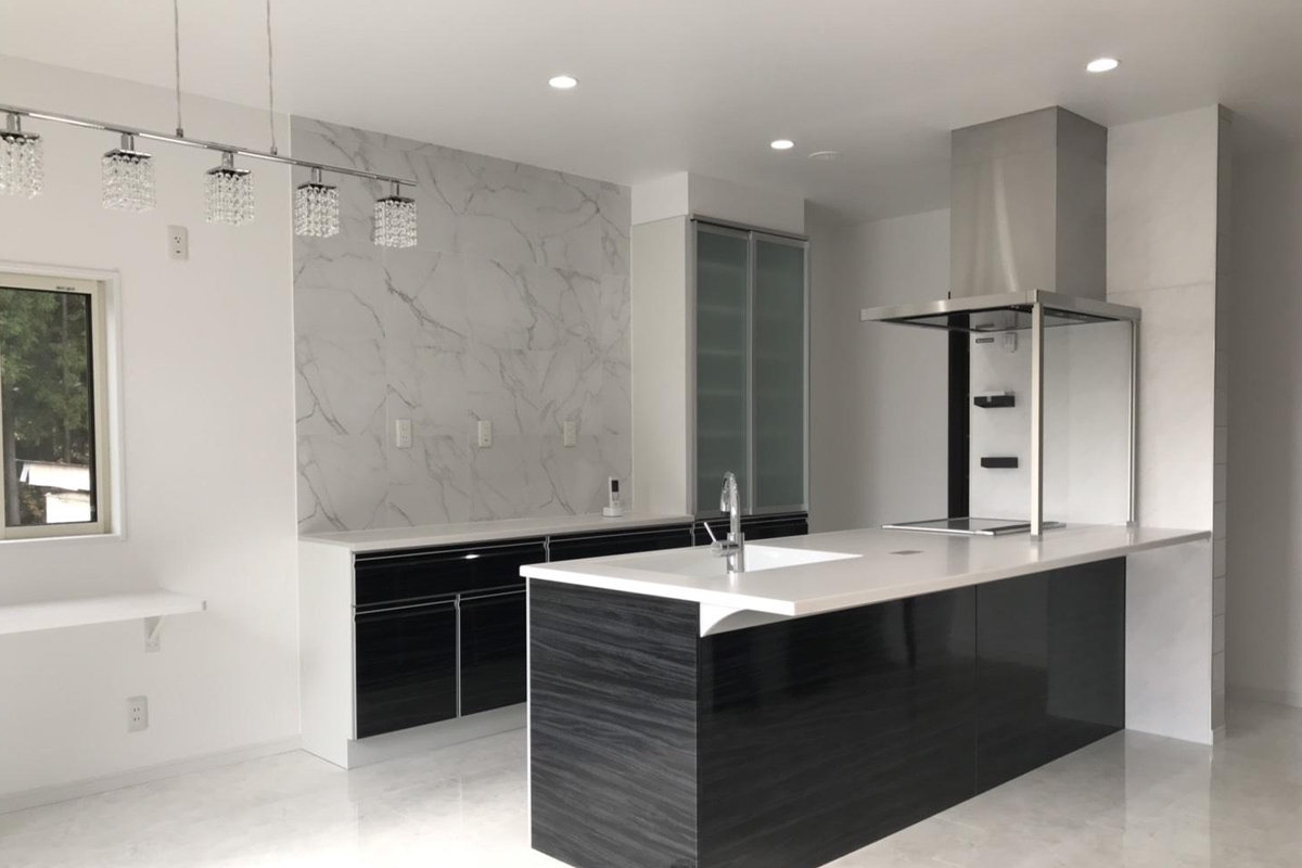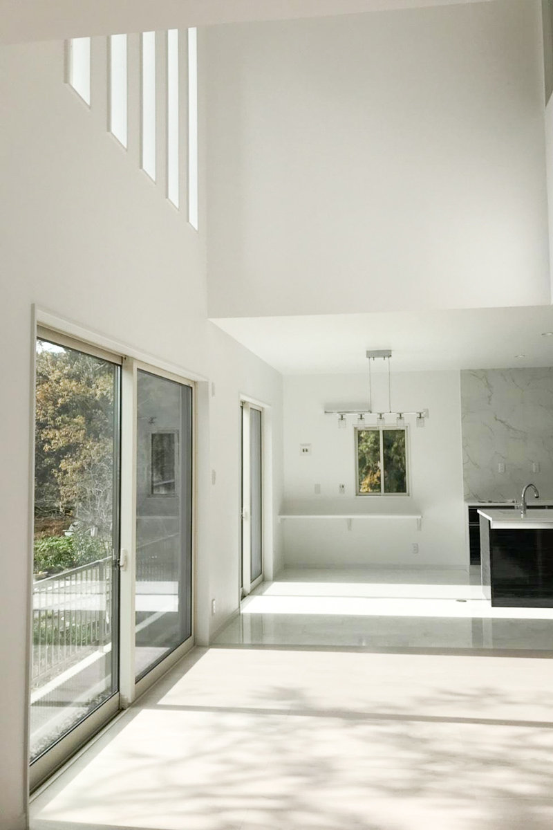 約25帖の広々としたリビングは上部の吹き抜けの採光を取り入れ、明るく開放的な空間に。 フロアタイルとウォルナットブラックの洗練されたキッチンがよりオシャレ感をアップさせています。1Fは収納スペースを十分にとり、家事動線を考えた間取りになりました。